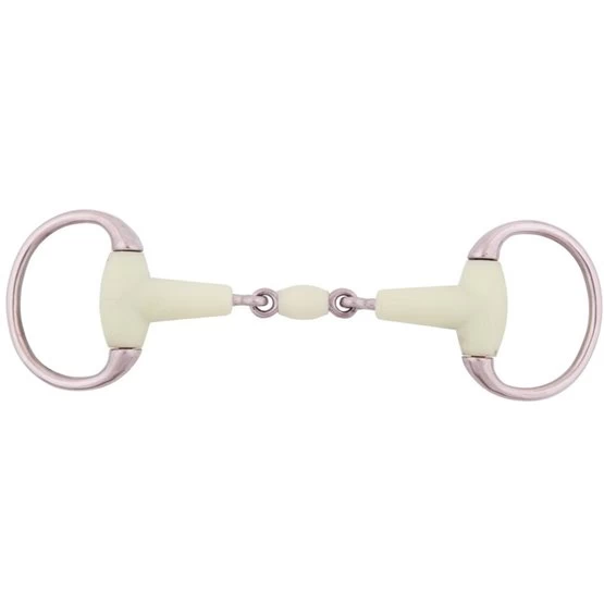 Doppelt gebrochene Olivenkopftrense mit Apple Mouth Mundstück und Edelstahlringen von 65 mm. Gebissdicke von 18 mm.