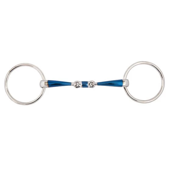 Diese doppelt gebrochene Wassertrense enthält Ringe aus massivem Edelstahl und ein Mundstück aus Baustahl kombiniert mit einer Sweet-Iron-Schicht auf dem Mundstück (blau). Die Speichelproduktion wird noch zusätzlich gefördert durch die Sweet-Iron-Schicht auf dem Mundstück. Wenn dieses Material reagiert mit Feuchtigkeit, Wärme und Luft wird es oxidieren und einen süß schmeckenden Oberflächenrost entwickeln. Letztendlich verschwindet die blaue Farbe, aber der Geschmack des Oberflächenrostes bleibt. Das Mundstück ist 14 mm stark und die Gebissringe haben einen Durchmesser von 65 mm.