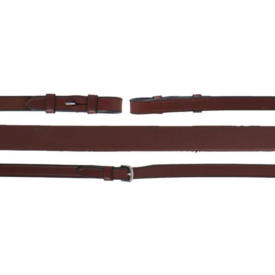 Dieser Gummizügel (16 mm breit) ohne Stopps und mit verstärkender Nyloneinlage bietet perfekten Halt. Die Lederenden haben Zaumhaken.