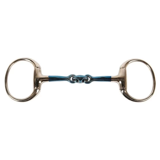 Diese doppelt gebrochene Olivenkopftrense ist anatomisch geformt, damit sie gut im Maul liegt. Das Mundstück ist aus Sweet Iron. Sweet Iron bildet bei Kontakt mit (Luft-)Feuchtigkeit Rost an der Oberfläche. Dessen süßlicher Geschmack stimuliert auf natürliche Weise die Speichelproduktion und wird besser dadurch angenommen. Die dunkelblaue Farbe des Mundstück verändert sich durch die Oxidation in eine braungraue Farbe
