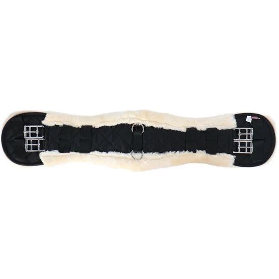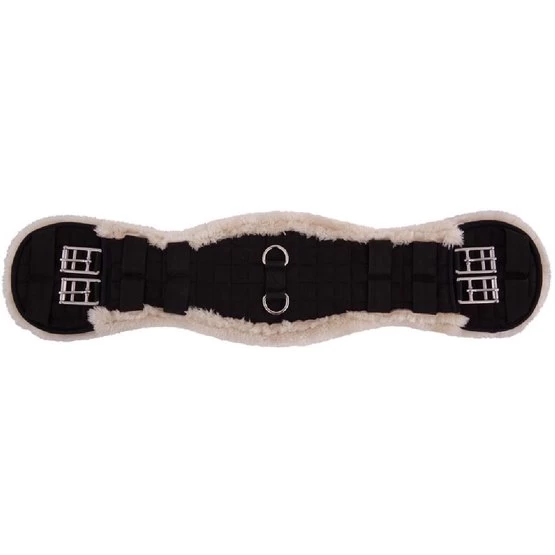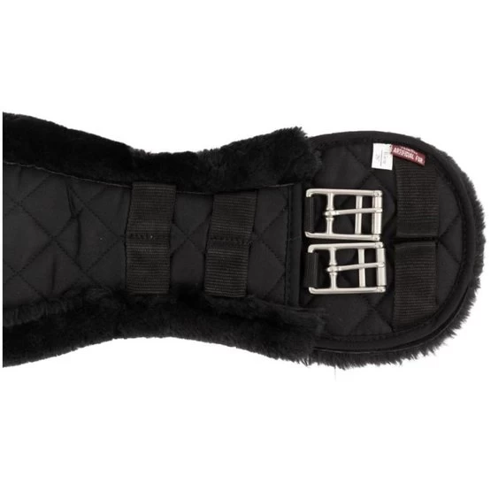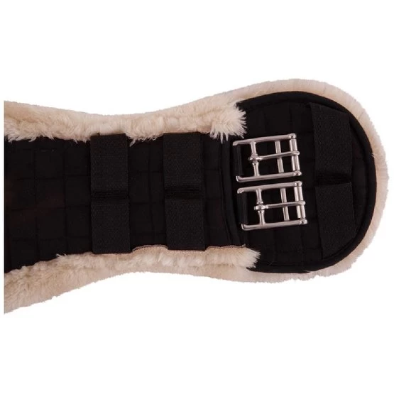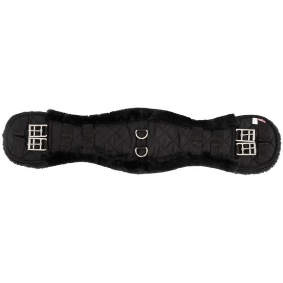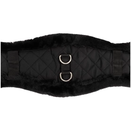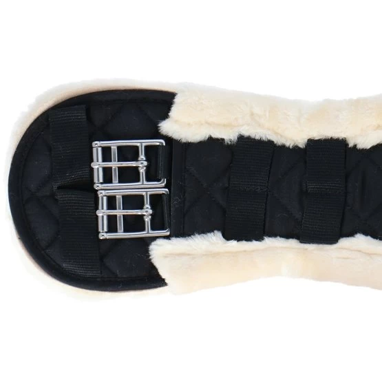 Anatomisch geformter Dressurgurt aus gesteppter Baumwolle mit einem schönen Futter aus synthetischem Lammfell (100% Polyester), das sich kaum von echtem Lammfell unterscheidet. Diese schaffreundliche Variante ist sehr weich, leicht, atmungsaktiv und besonders pflegeleicht. Das synthetische Fell ist maschinenwaschbar bei 30°C und ist auch für den Trockner geeignet. Zudem bleibt das Material lange schön und löst sich nicht ab. Der Gurt ist mit zwei D-Ringen in der Mitte zur Befestigung von Hilfszügeln ausgestattet. Das anatomische Gurtdesign bietet dem Pferd optimale Bewegungsfreiheit. Der Gurt ist mit Rollschnallen aus Edelstahl versehen, was das Angurten erleichtert. Dank der festen Gurtschlaufen bleibt der Gurt perfekt an seinem Platz.