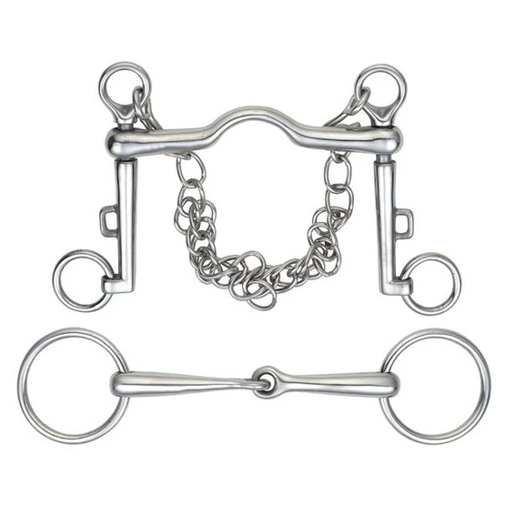 Dieses Weymouth-Set in voller Größe hat einen losen Ring-Bradoon, um mehr Bewegung zu ermöglichen. Dicke des Mundstücks: 14 mm Durchmesser / 14 mm Bradoon. Wangenhöhe: 125mm Weite / 55cm Bradoon.