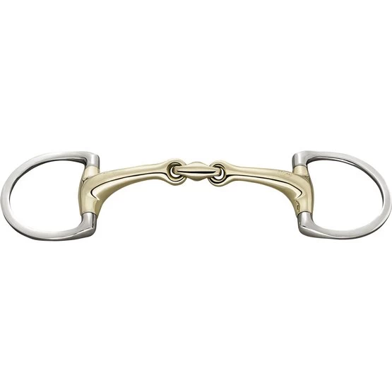 Doppelt gebrochene dynamische Trense in D-Ring-Form. 16 mm dick. 14,5 cm breit. Material Sensogan mit Edelstahlringen. Die ergonomische Form sorgt für eine weiche und gleichmäßige Druckverteilung. Das Mittelteil ist um 45 Grad geneigt, damit das Gebiss optimal auf der Zunge liegt. Stimuliert die Annahme des Gebisses. Geeignet für sensible Pferde oder Pferde mit dicker Zunge. Liegt stabil im Mund durch die seitlichen Begrenzungen der festen Ringe.