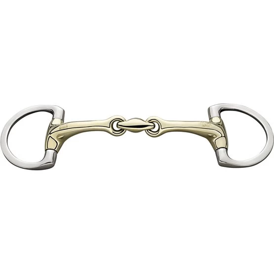 Trensen in D-Ring-Form mit doppelt gegliederter dynamischer Unterlage. 14 mm dick. 10,5 cm breit. Material Sensogan mit Edelstahlringen. Die ergonomische Form sorgt für eine weiche und gleichmäßige Druckverteilung. Das Mittelteil ist um 45 Grad geneigt, damit das Gebiss optimal auf der Zunge liegt. Stimuliert die Annahme des Gebisses. Geeignet für sensible Pferde oder Pferde mit dicker Zunge. Liegt stabil im Mund durch die seitlichen Begrenzungen der festen Ringe.