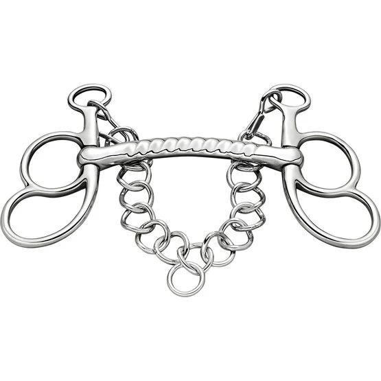 Ungebrochene Liverpool-Stange. 16 mm dick. 12,5 cm breit. Material: Edelstahl. Wird hauptsächlich beim Autofahren verwendet. Mundstück ist leicht gerippt. Der Druck liegt an den Seiten des Mundes.