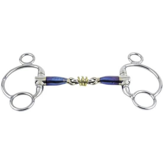 Das Mundstück mit Messing-Ringen ist eine Variante des doppelt gebrochenen Gebisses. Die Ringe in der Mitte regen das Pferd zum Spielen mit dem Gebiss an. Dadurch wird die Zungenaktivität erhöht, so dass das Pferd mehr Speichel produziert und die Kiefer sich mehr entspannen können.